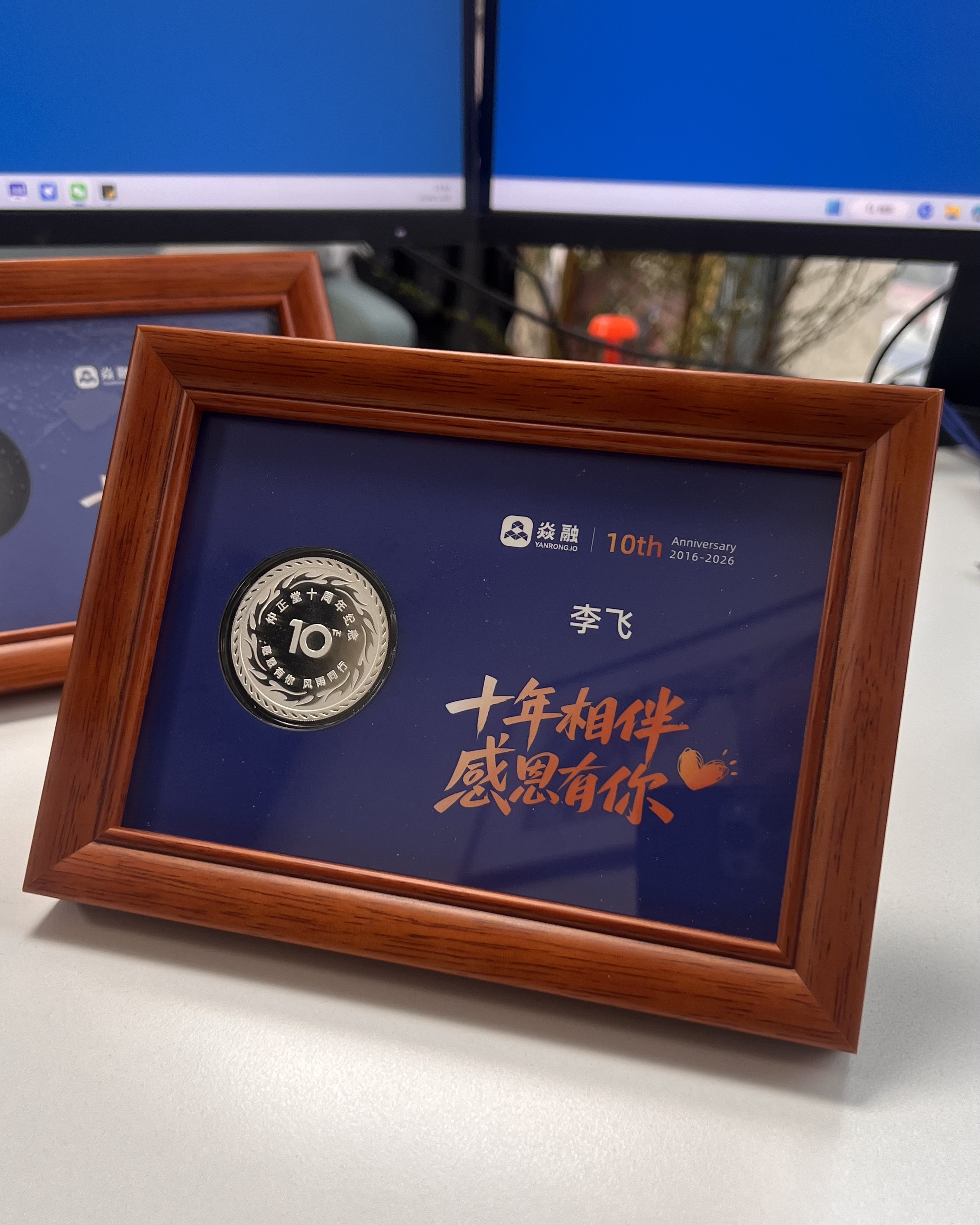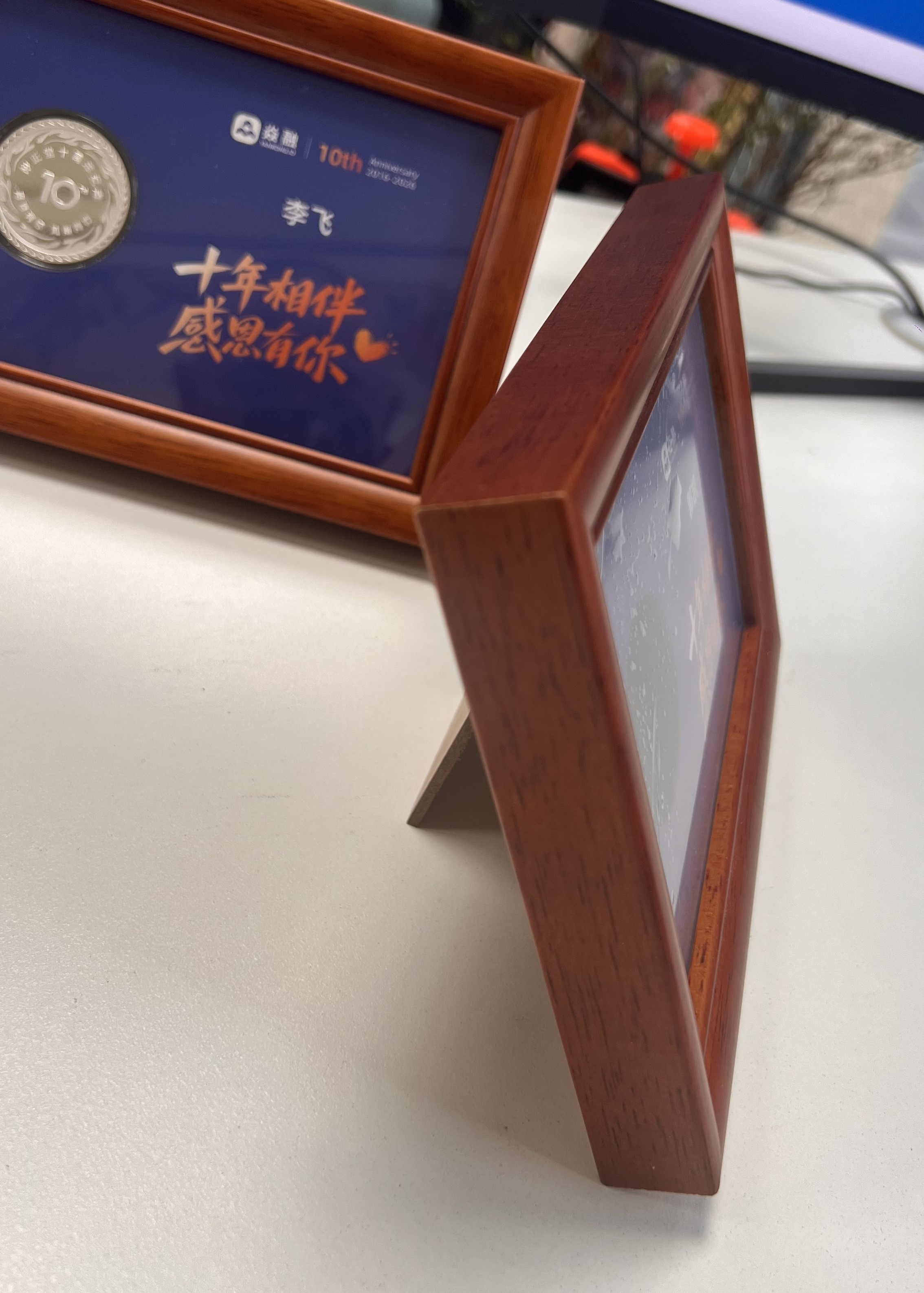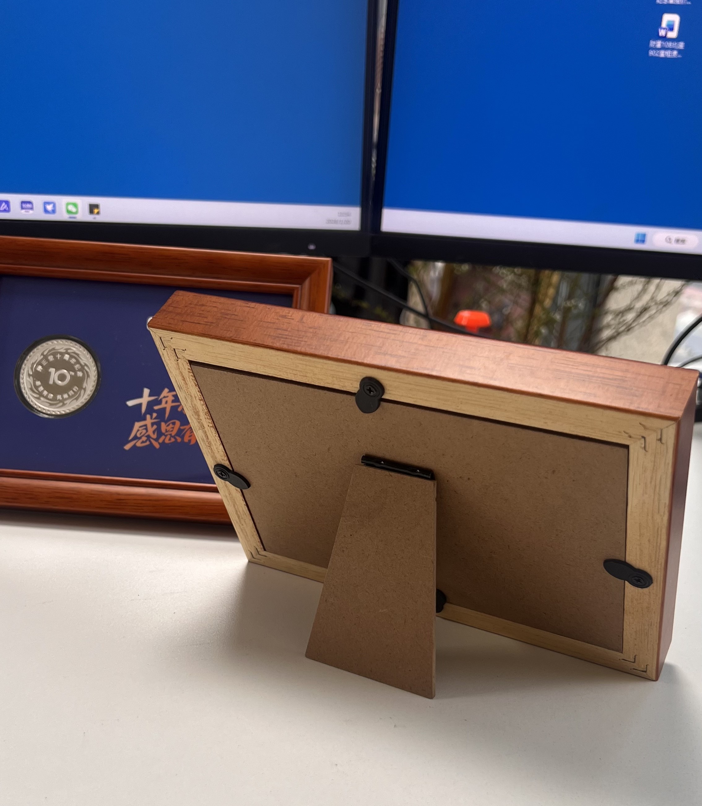 可镶嵌金银币的实木相框摆件