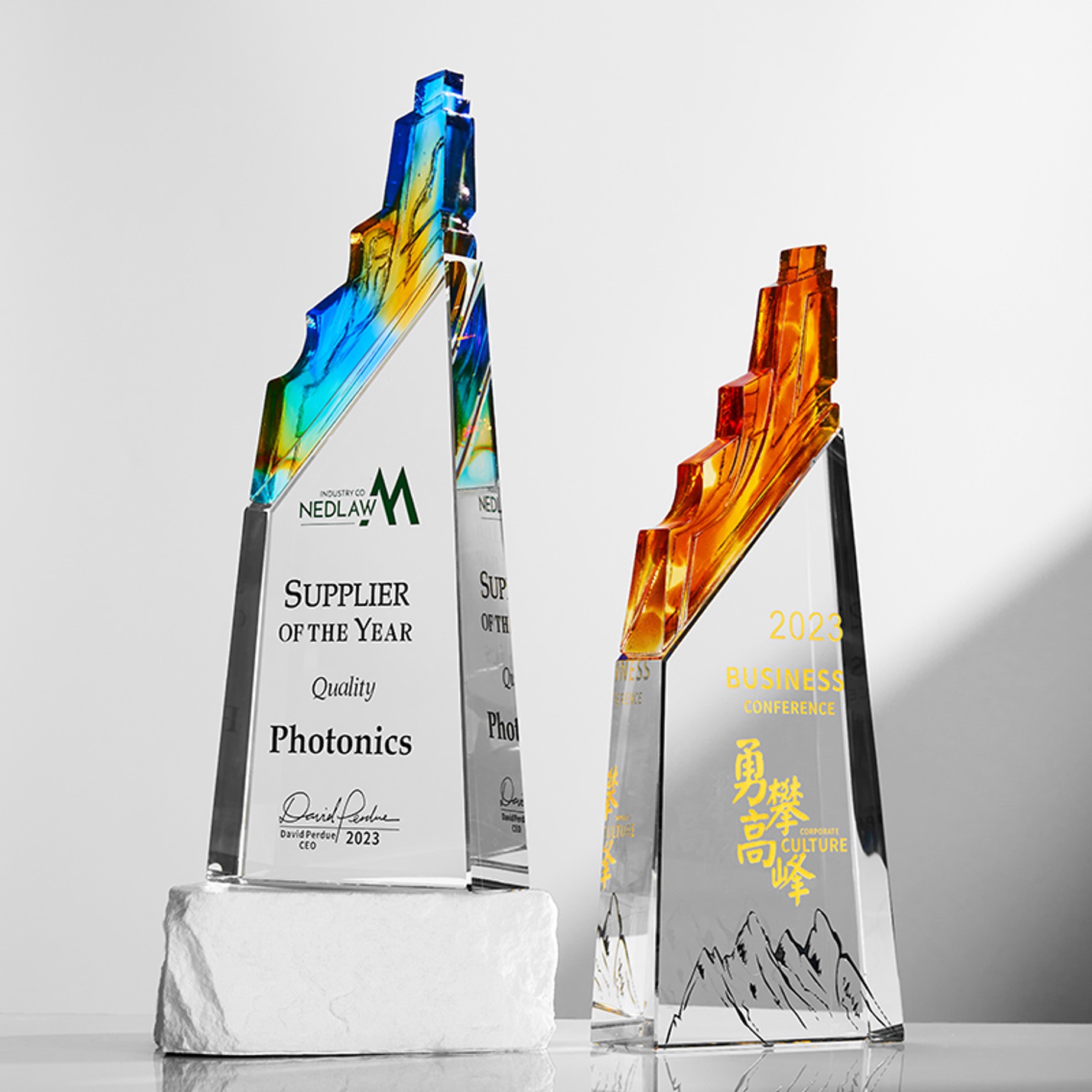 登峰造极,勇攀高峰,寓意的是克服各种困难后取得事业、学术上的巨大成就。此款奖杯整体造型运用了简约的琉璃山峰造型和透明水晶结合,时尚经典;欲登高峰,有积极进取、志向远大之义;不畏险峻,登上顶峰,不仅一种挑战,一个目标也是一种肯定!