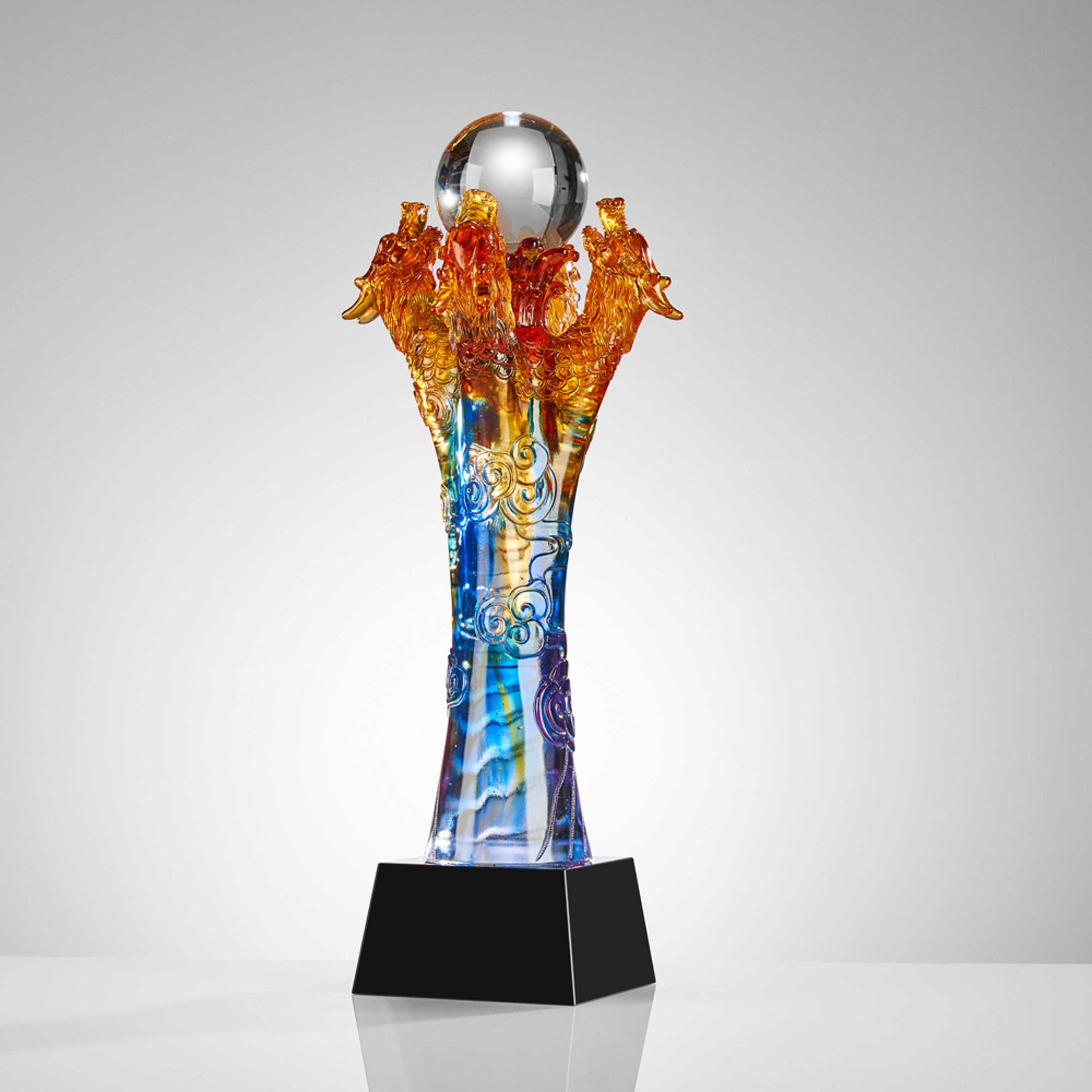 这款奖杯设计融汇了中国传统文化中龙的祥瑞寓意。四条龙代表着东、南、西、北四方的团结与祝福,共同托举着一颗珍贵的水晶球,象征着团结合作带来的共同成果。柱身以祥云和山川为装饰,彰显了获奖者在面对挑战时所展现出的无畏和勇气。整体设计旨在表彰获奖者在相关领域中的杰出成就,以及对他们不懈努力和卓越贡献的赞美。