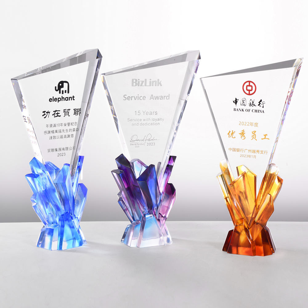 这是一款用晶体元素打造的奖杯,晶洞中的晶体是矿物质经过漫长的时间渗入形成的,结晶代表着沉淀的精华,一点点沉淀的精华汇聚发出的光芒正是我们的荣耀,是高级的,品质的,精英的光彩,用这款“荣耀”来为业界精英举杯,展现卓越成就,更是相得益彰。